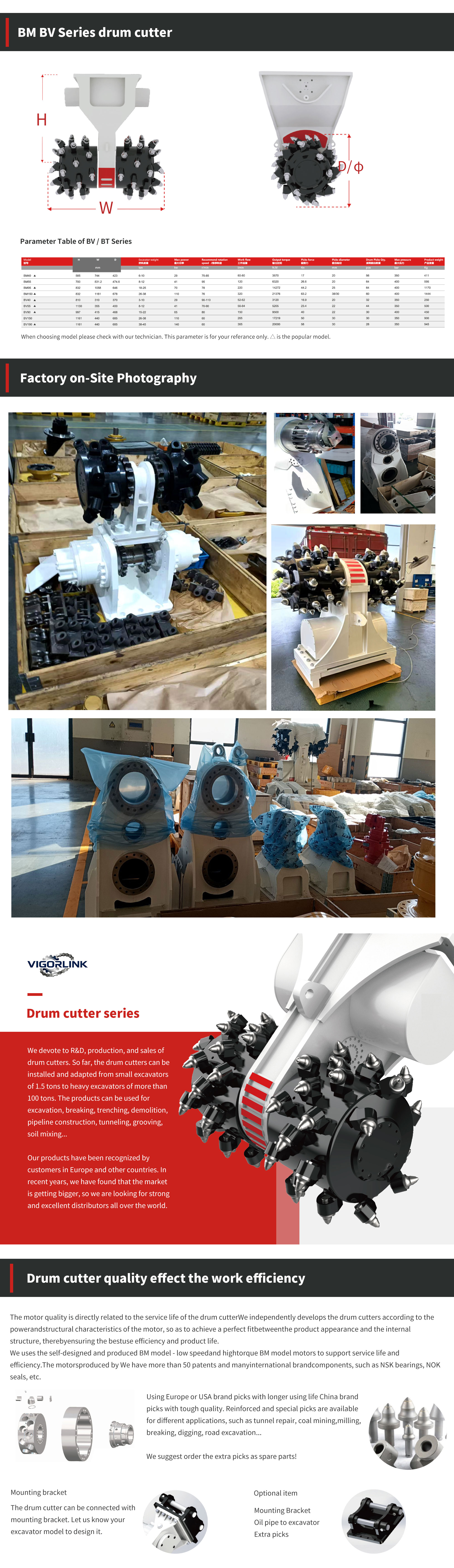 DetailDrum cutter seriesWe devote to R&D, production, and sales of drum cutters. So far, the drum cutters can be installed and adapted from small excavators of 1.5 tons to heavy excavators of more than 100 tons. The products can be used for excavation, breaking, trenching, demolition, pipeline construction, tunneling, grooving, soil mixing...Our products have been recognized by customers in Europe and other countries. In recent years, we have found that the market is getting bigger, so we are looking for strong and excellent distributors all over the world.Drum cutter quality effect the work efficiencyThe motor quality is directly related to the service life of the drum cutter We independently develops the drum cutters according to the power and structural characteristics of the motor, so as to achieve a perfect fit between the product appearance and the internal structure, therebyensuring the bestuse efficiency and product life.We uses the self-designed and produced BM model - low speed and hight or que BM model motors to support service life and efficiency.The motors produced by We have more than 50 patents and many international brand components, such as NSK bearings, NOK seals, etc.Using Europe or USA brand picks with longer using life China brand picks with tough quality. Reinforced and special picks are available for different applications, such as tunnel repair, coal mining,milling, breaking, digging, road excavation...We suggest order the extra picks as spare parts!Mounting bracketThe drum cutter can be connected with mounting bracket. Let us know your excavator model to design it.Optional itemMounting BracketOil pipe to excavatorExtra picks